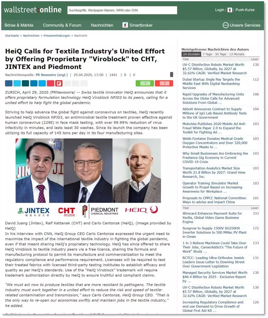 JINTEX & HEIQ GLOBAL STRATEGIC COOPERATION - S'UNIR EN TEMPS DE CRISE POUR CONTRIBUER À LA LUTTE CONTRE L'ÉPIDÉMIE.